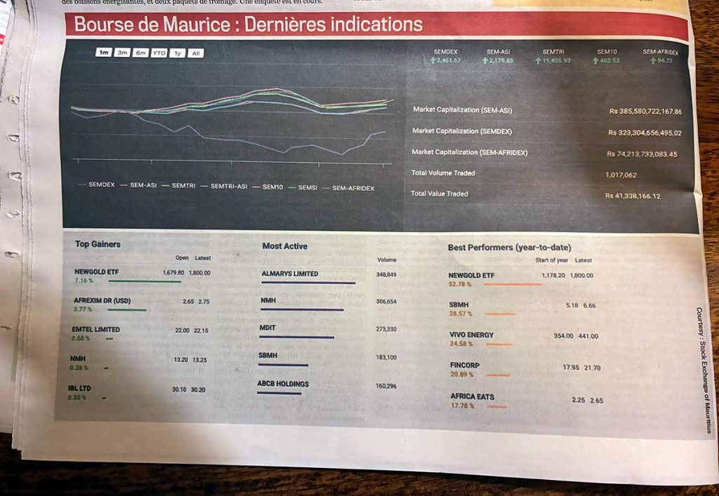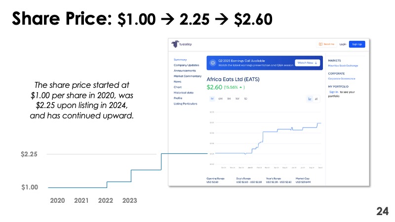 Africa Eats listed on the Stock Exchange of Mauritius 11 months ago. How is the stock performing as a public company. Fifth best performer year-to-date, up 18% for the year: